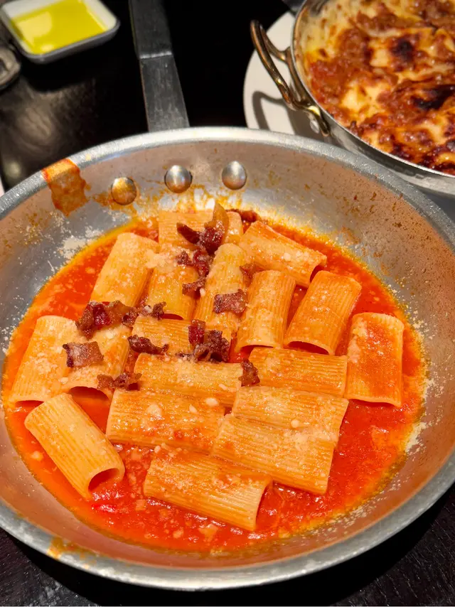 「豬頰肉蕃茄醬粗管通粉」原鑊上枱,打卡且必食!粗管通粉煙韌彈牙掛汁👍,豬頰肉肉嫩鹹香,蕃茄醬酸甜濃郁。