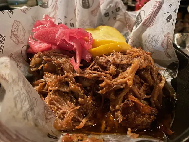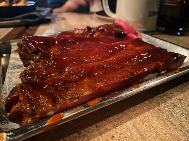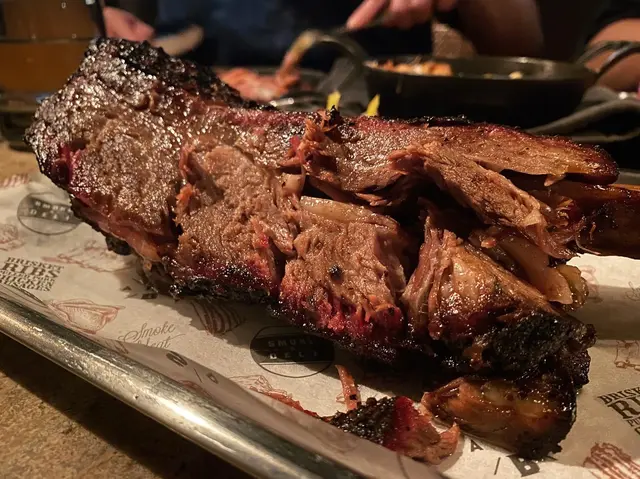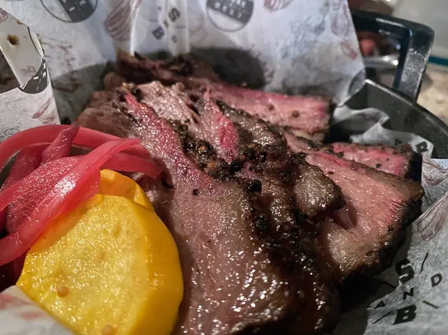 美式烤牛胸肉,有幾件偏瘦既肉食落有啲鞋,半肥瘦既就香口好食