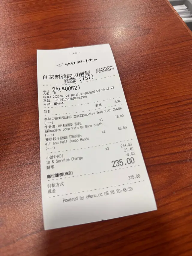 好似去咗韓國一樣🇰🇷 Koeiyan等級42025-10-11129 瀏覽 關注 今晚同朋友喺尖沙咀行完街,去咗山林道呢間[自家製韓國刀削麵]試佢哋嘅刀削麵。餐廳唔算好大,但坐得幾舒服,啱晒同朋友傾住計慢慢食。我點咗花蛤刀削麵,湯底清甜,飲到淡淡嘅海鮮味。花蛤食落幾鮮甜。朋友叫咗牛骨湯刀削麵,湯頭濃郁得嚟唔會太鹹,飲完成個身暖笠笠。雖然麵條唔係即場削,但口感依然煙韌,咬落去有嚼勁,掛湯效果唔錯。另外叫咗份蒸雙拼餃子,有豬肉同泡菜兩款。豬肉餃餡料飽滿,咬開有肉汁;泡菜餃就微微辣,幾開胃。餃子皮厚薄適中,蒸得剛剛好,唔會太乾或者太濕。食物質素唔錯,價錢都便宜。如果想喺尖沙咀食碗熱辣辣嘅韓式刀削麵,呢間係個唔錯嘅選擇。以上食評乃用戶個人意見 , 並不代表OpenRice之觀點。讚好分享好似去咗韓國一樣🇰🇷 自家製韓國刀削麵 (山林道) https://s.openrice.com/QrbT0TCDU00檢舉 張貼 評分5味道5環境5服務5衛生5抵食用餐途徑堂食
