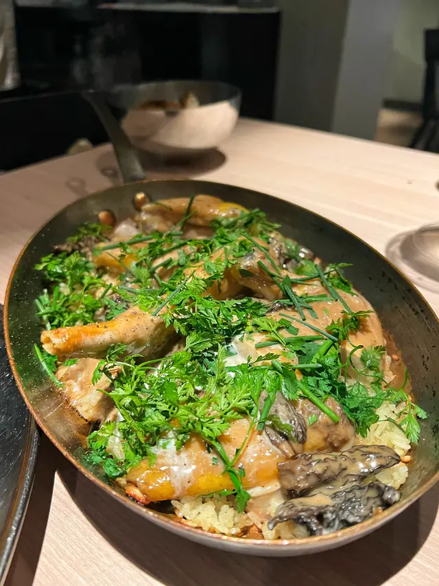 三個人總共叫咗萵筍沙律,北海道生蠔,魷魚仔,牛骨髓with魚子醬,石斑魚腩,Salt Baked Chicken Rice,wagyu ribs steak,甜品仲有一枝wine🫢