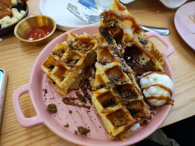 甜品都係食返依舊窩夫,配返雪糕,口感升返級,我自己最滿意依個,麻糬窩夫就係要中間煙韌,面頭脆,外脆內軟就好味。建議佢改良一下,如果佢成舊窩夫做返厚身啲似格餅口感或者索性變薄脆配合中間麻糬軟感,用佢嚟做主打相信會好吸引。