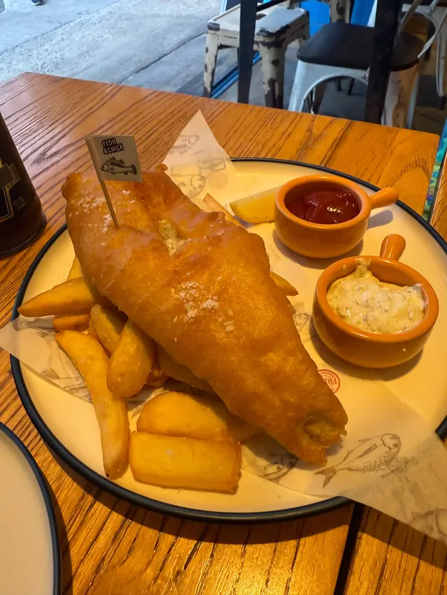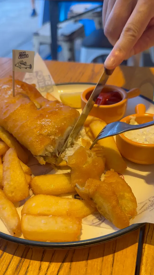 海鱸魚肉質滑嫩,炸魚外脆內嫩,魚肉鮮甜,薯條金黃香脆,搭埋一齊食又吹住海風,還可以加埋檸檬汁,味道更加清新。