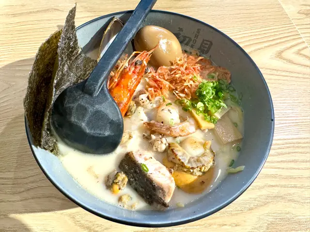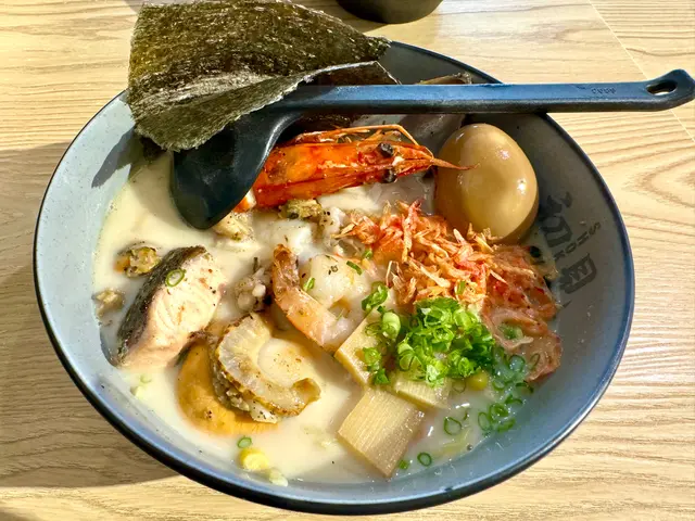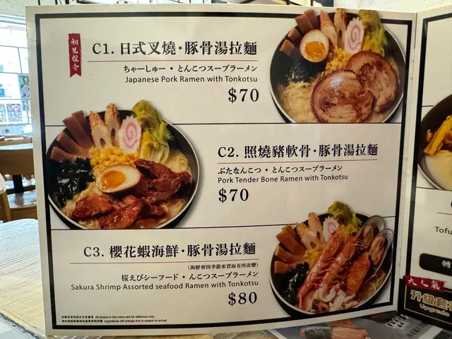 「櫻花蝦海鮮・豚骨湯拉麵🍜」:海鮮包括大蝦、帆立貝、魷魚、青口,咁當然仲有脆脆哋嘅櫻花蝦😋,豚骨湯底都係幾濃郁😋