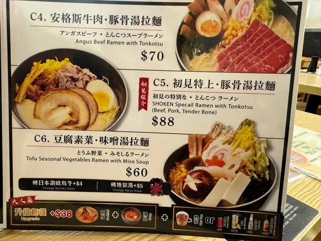 $88「初見特上•豚骨湯拉麵 初見の特別な・とんこつラーメンSHOKEN Special Ramen with Tonkotsu (Beef, Pork, Tender Bone)」同埋 $80「櫻花蝦海鮮・豚骨湯拉麵 桜えびシーフード・とんこつスープラーメン Sakura Shrimp Assorted Seafood Ramen with Tonkotsu」,加全玉(原隻溏心蛋)(+$12)🤣