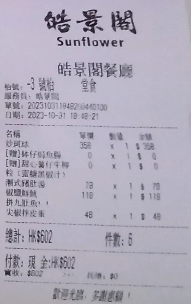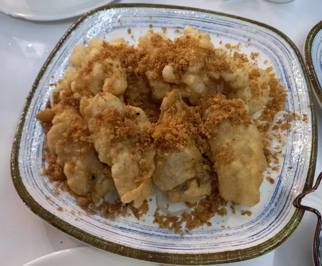 10月31日,揾食肥華約咗靚媽及細仔仔,到此間口碑不俗嘅,街坊飯店形式小菜館食晚飯,今餐肥華目標首要,係試此店個雞蛋焗魚腸,所以呢餐,除咗此味小菜外,其他菜色,都係由靚媽及細仔仔發辦,首個上枱嘅,潮式豬肚湯,湯濃美味又夠熱,肥華就覺得相當好,但靚媽及細仔仔則,嫌此湯略咸,跟住出場嘅,翡翠炒班球,蜜糖黑椒薯仔牛柳, 椒鹽鮮魷拼九肚魚 尖椒伴皮蛋,都係Ok之作,都得到我哋三人好評,至於得肥華獨享嘅,此店名物之一,雞蛋焗魚腸更是出色,不負肥華厚望,加上此店小菜收費相宜,侍應員工招呼到位,隨時會成為肥華,另一個讌客地點👍👍👍👍