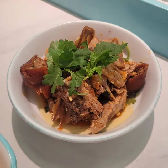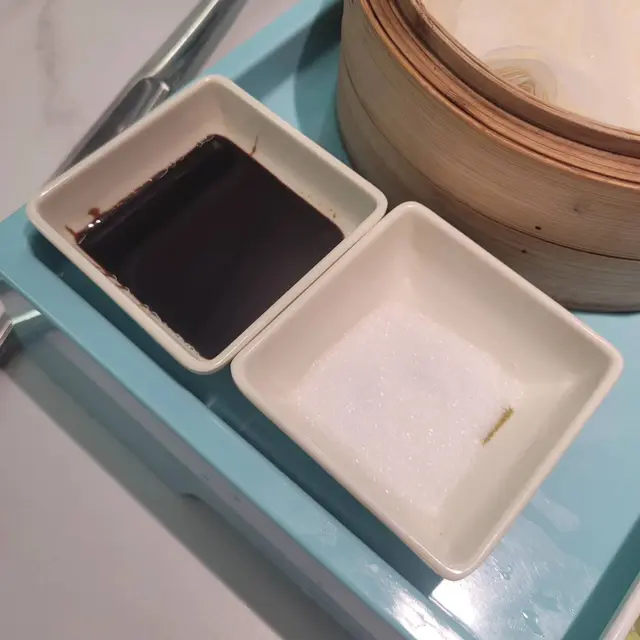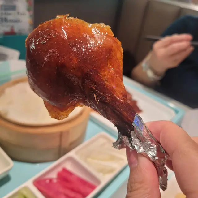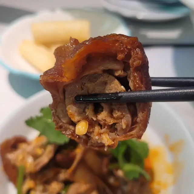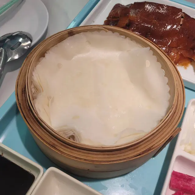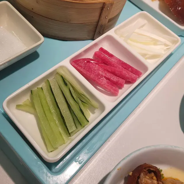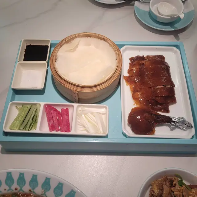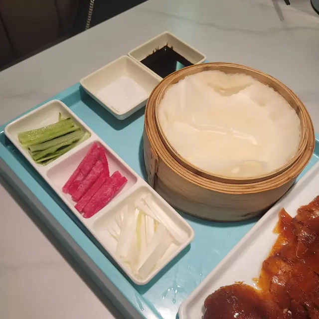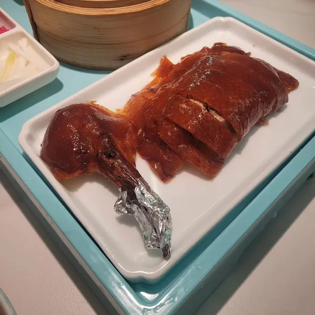 片皮鴨(半隻)琥珀色的外皮多誘人,鴨肉鮮嫩多汁,擺盤精緻整齊,光看就令人垂涎三尺。建議先吃一小口原味,之後再沾點砂糖,砂糖能平衡鴨皮的油脂,鴨皮酥香薄脆,皮下的脂肪爆開,瞬間在嘴裡化開,一種入口即化的風暴在嘴中展開。