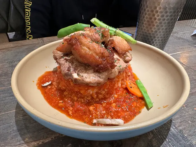飯面鋪滿了肉醬,雞扒碎上(只得3-4塊仔)、豬扒一塊;點知雞扒是涼涼的,完全唔熱,豬扒還好,是熱的,飯好似未熟透,有啲餃口😥 。