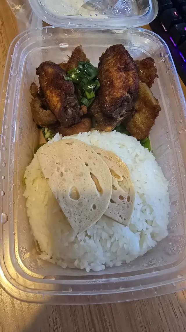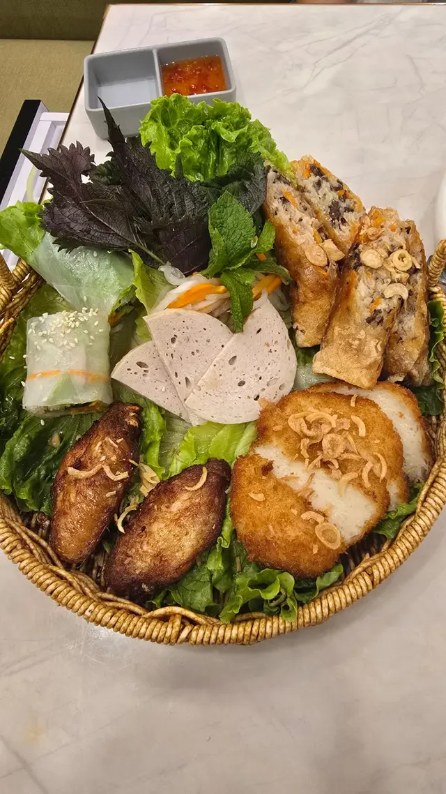 拼盤包含春卷、炸雞翼、炸蝦餅、米紙卷和爽脆蔬菜,佐以一小碟辣醬和甜醬,增添風味。春卷外皮酥脆,