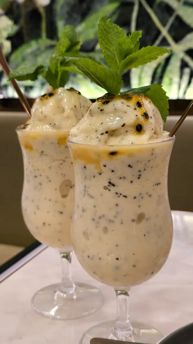 這份熱情果沙冰以精緻的高腳杯盛裝,視覺上令人耳目一新。冰沙呈淡黃色,點綴著黑色熱情果籽,