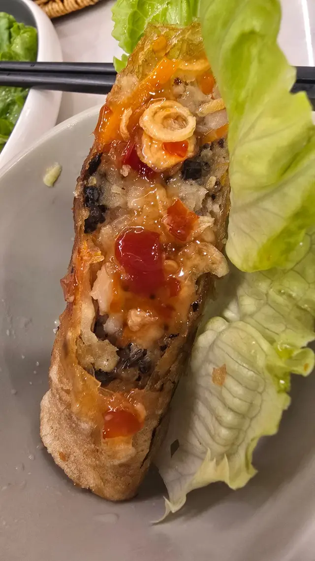 炸蝦餅香脆多汁,魚香濃郁,搭配蔬菜的清新口感平衡油膩。米紙卷清爽透薄,內藏蝦和薄荷葉,