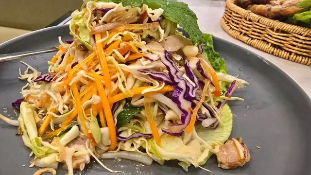 這道沙律菜的味道清新而豐富。新鮮蔬菜如生菜、紫椰菜、椰菜和紅椒,帶來脆爽的口感與自然的甜味,