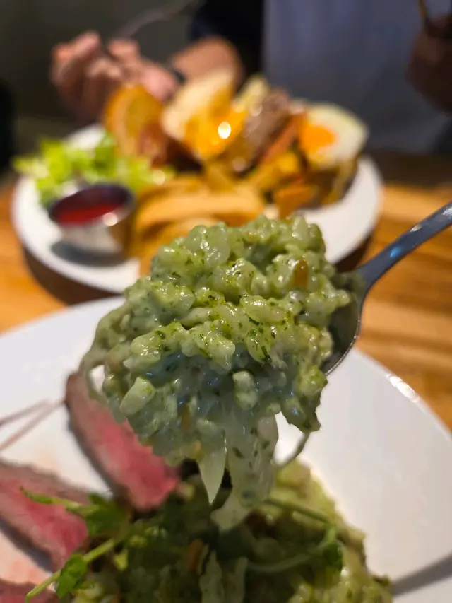 牛側腹煎得中間依然粉嫩,配酸酸地黑醋汁,肉味保持到仲更加開胃,再多幾片就好🤤意大利飯軟硬度恰到好處,第一次食青醬既意大利飯,青醬包裹到每一粒飯,濃稠度亦拿捏得好好😌非常惹味