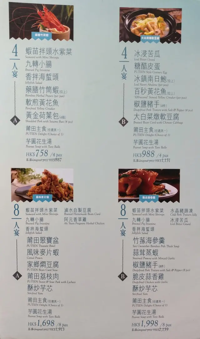 菜色選擇好多,大部份都不是普通中菜店常見嘅菜色,有部份新菜色我地對上一次去荃灣店食時亦未有,所以我地今日點的都係以新菜色為主,有九轉小腸、百味黃花魚、傳統扁肉湯 、興化炒米粉、蝦苗拌頭水紫菜同酥炒芋芯,4個人食應該都夠食。