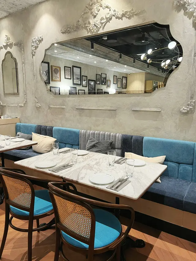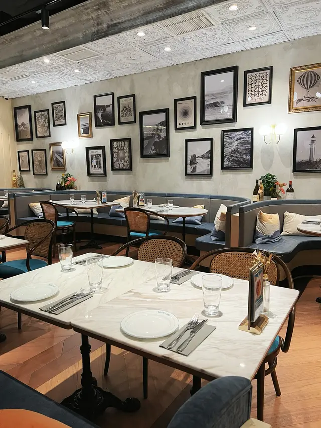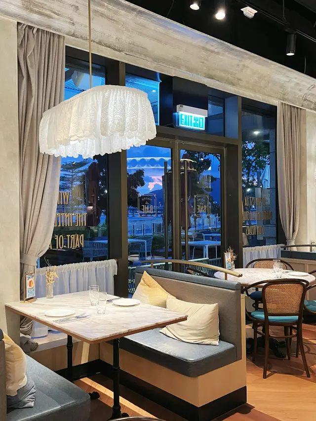 店內環境悠閒舒適又寬敞,裝潢採用白色為主調,擺放林林總總的掛畫,充滿法國巴黎風情,窗邊更能飽覽海景,氣氛浪漫。