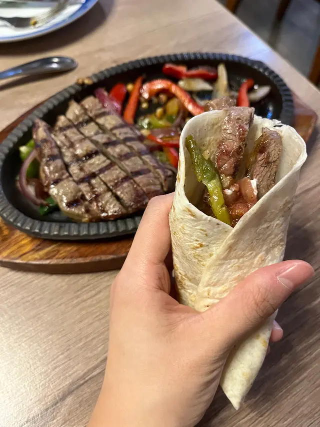 ✨鐵板上牛肉出晒煙火力超強, 但好彩有層椒同洋蔥墊住唔會overcook, 雖然都熟晒, 但都keep到勁多肉汁, 個tortilla wrap好軟熟, 自己控制份量鍾意包到啖啖肉又得, 多菜少肉又得, 再加埋yogurt/avocado/tomato sauce好惹味