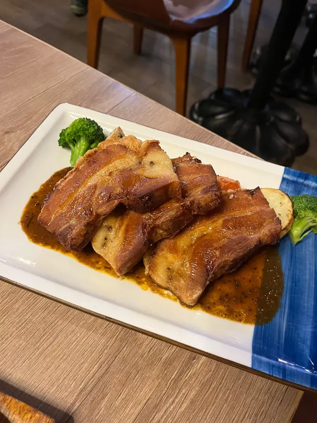 ✨厚切pork belly個皮先係重點, 勁脆; 腩肉唔算超級肥, 所以食落稍乾, 但點左黑椒汁都幾好味