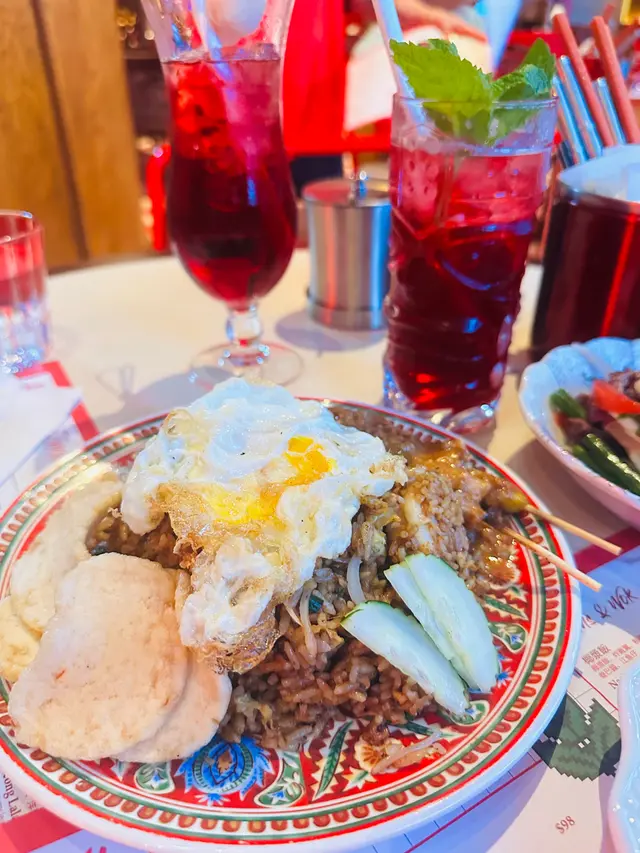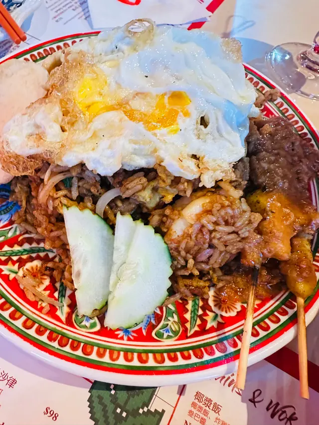 炒飯粒粒分明,鑊氣足;大蝦爽彈新鮮,沙爹雞肉串燒嫩滑不柴。醬油與香料炒出濃郁鹹香,沙爹醬與花生微甜微辣,突顯正宗馬來風味。