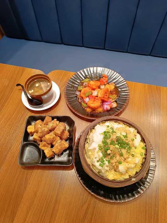 小菜夠鑊氣,燉湯夠香濃 JasmineLau7007等級42025-01-14309 瀏覽 關注 小菜夠鑊氣,燉湯夠香濃,坐位闊落舒適。🍚🐟荷香籠仔龍躉蒸飯雞蛋炒飯底上舖滿龍躉魚塊,龍躉肉彈牙爽口,魚皮滿滿的膠質。一大匙蒜油和一大把炸蒜還滲著荷葉味,真的好香😍愛海鮮和蒜的,絕不能錯過。🧈椒鹽豆腐雞蛋豆腐,外皮炸到卜卜脆,灑上椒鹽和炸蒜,香脆惹味。🍤🥭香芒貴妃大蝦球蝦球好大隻,有六件。三色椒、香芒、洋蔥炒香,以糖醋醬打芡,酸酸甜甜好下飯。🍲川貝雪梨排骨燉湯肉排大大舊,湯頭非常甘甜可口,沒有味精味。天氣乾燥,潤喉一流。以上食評乃用戶個人意見 , 並不代表OpenRice之觀點。讚好分享小菜夠鑊氣,燉湯夠香濃 鋿晶館 (上水匯) https://s.openrice.com/QrbT0o7yiW0檢舉 張貼 評分5味道5環境4服務4衛生4抵食用餐途徑堂食