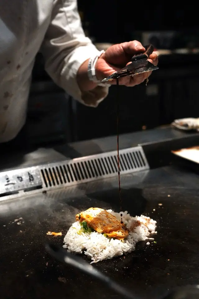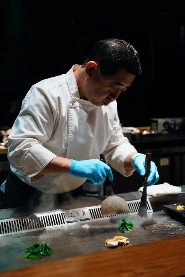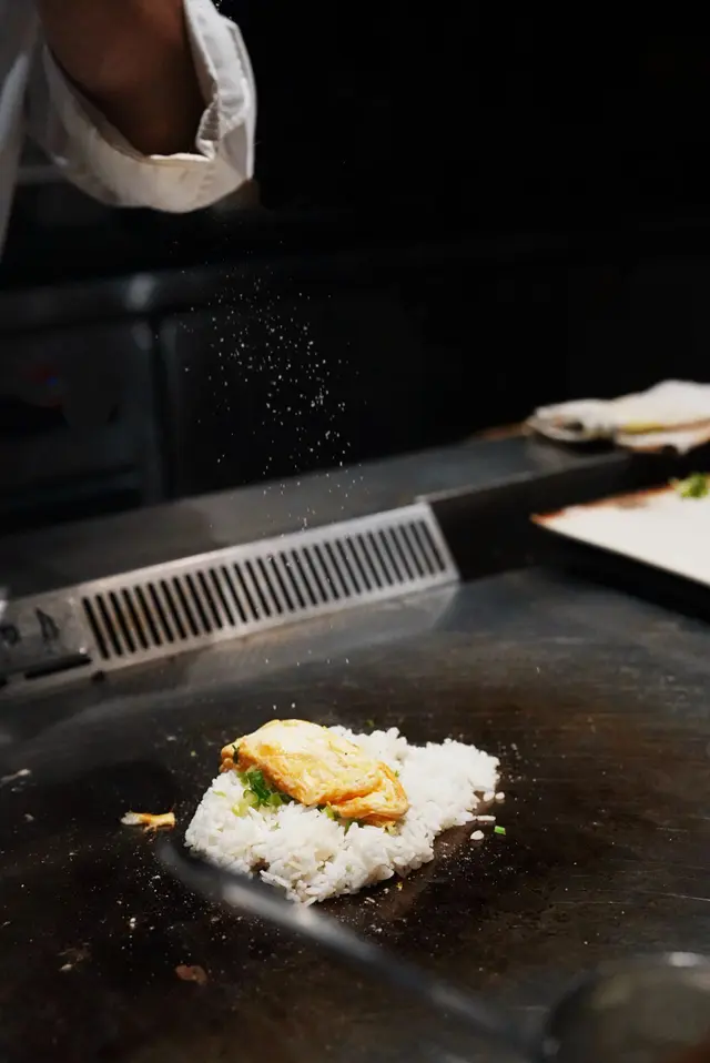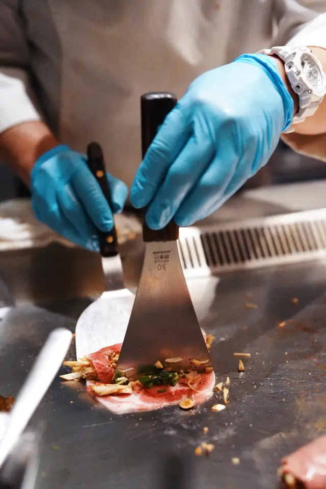 師傅用兩支鏟子 巧妙將蛋液在鐵板上快速劃散