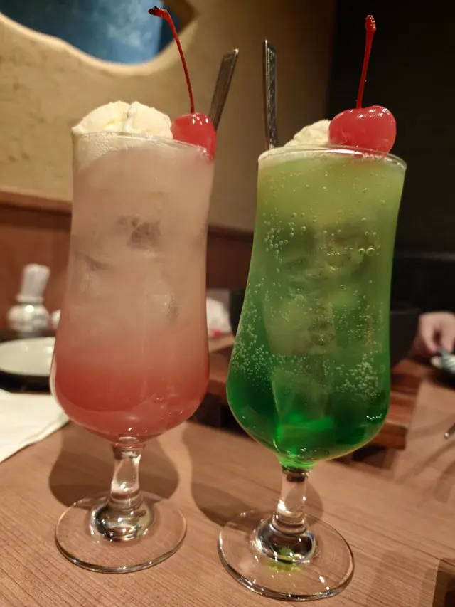- 雪糕梳打雙拼:特意加點的蜜桃、哈密瓜雪糕梳打太加分!蜜桃味果香清新,哈密瓜味甜得醇厚,綿密雪糕浮在冰爽梳打上,一口下去冰涼解膩,剛好中和前菜與刺身的鮮膩,讓味蕾保持清爽。