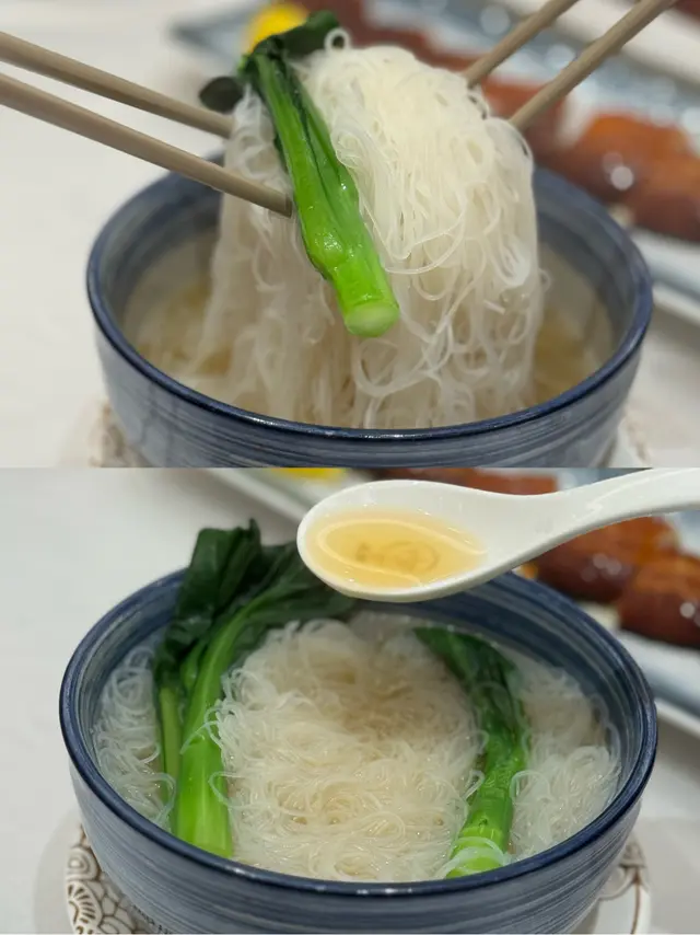 叫咗一碗雞湯米粉,材料簡單上面有兩棵菜仔,米粉就浸喺雞湯入面,雞湯清甜,加米粉一齊食呢就啱啱好