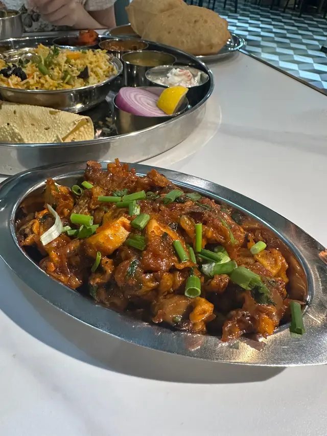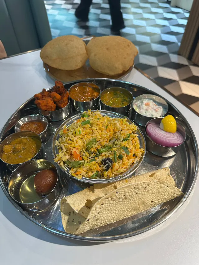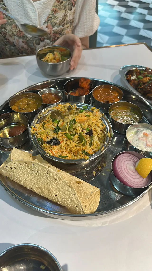 至於個北印度Thali簡直係選擇困難症救星~ 一個大鐵盤裝住七八款小碟,好似開寶藏咁!最正係個咖喱,香料層次豐富得嚟唔會太辣,配返牛油烤餅一齊食,真係絕配!仲有印度飯、豆蓉、酸奶、甜品,每樣都細細碟可以試勻唔同味道。特別欣賞個印度脆波,倒入酸甜醬汁,口感同味道都好過癮!