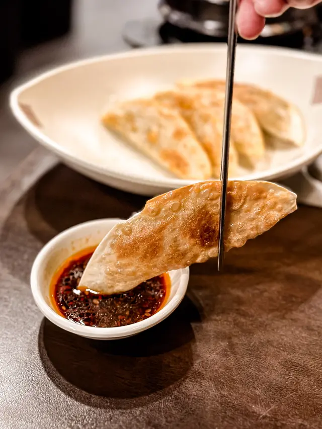 金黃酥脆的半月形餃子,外皮煎得薄脆如紙,內餡卻飽滿得驚人——肉末混入彈牙粉絲,口感立體,蘸上微酸的韓式醋辣醬,更顯風味。