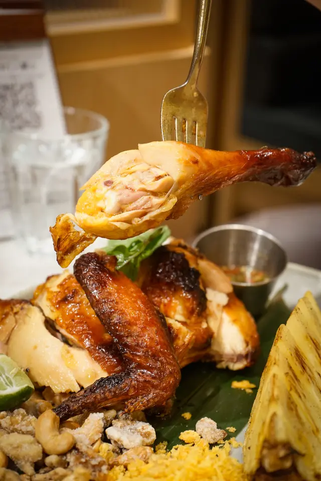 必食推薦!雞皮燒到金黃香脆,仲有淡淡棕櫚糖嘅甜香~肉質超嫩滑,點埋佢哋特製嘅酸辣醬,真係停唔到口!呢個真係我食過數一數二好味嘅泰式燒雞💯