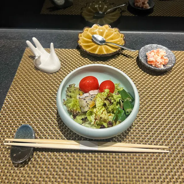 有秋葵、車厘茄、火龍果同其他新鮮蔬菜,用醋汁調味,酸酸地好開胃