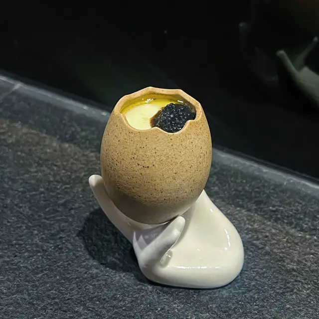 師傅會喺我哋前面煎香鵝肝,再於席前蒸煮個蒸蛋,蒸蛋好嫩滑,加上黑魚籽同鵝肝,咸香十足😋 而且帶有鵝肝嘅油香,好食!