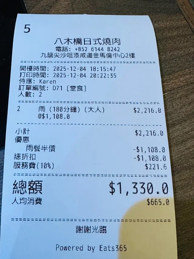 總括嚟講,呢間任食燒肉,和牛質素、食材種類都夠晒誠意,買一送一抵到爛(霞套餐晚上5:00前入座),燒肉控一定要衝啊 ! 係呢度食燒肉真係高級享受,環境同服務都冇得輸,水準直逼日本高級燒肉店,一定會再嚟!
