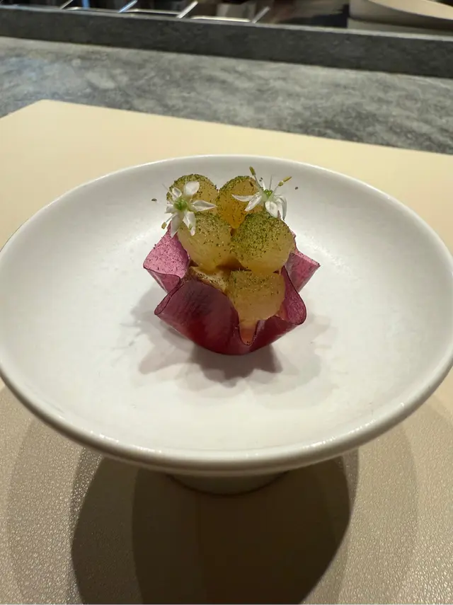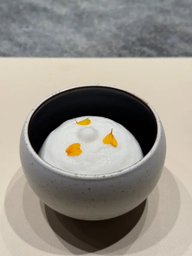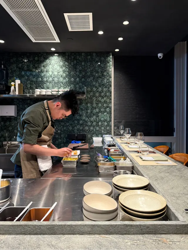 餐廳裝潢簡約型格,坐到8個人,店面雖然不算大,但座位之間有一定嘅間距,送上每樣食物時Chef都會講解道菜用咩材料同方式去煮。晚市只提供tasting menu $1,380pp,加$580有wine pairing,需要提前訂枱。Staff又nice又專業,開心🥳