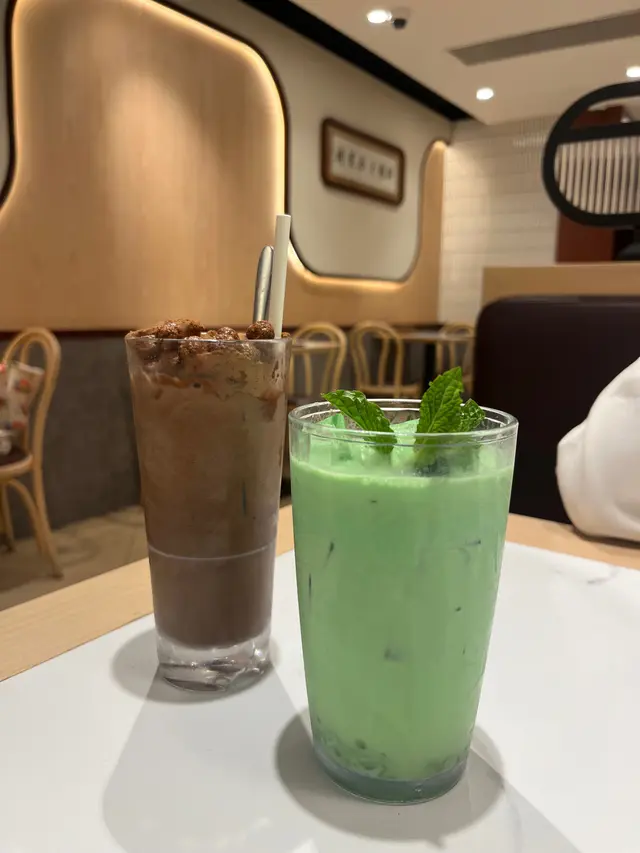 !我點了一杯椰汁班蘭冰,質感順滑,帶濃郁椰香味。朋友就選了美祿恐龍。
