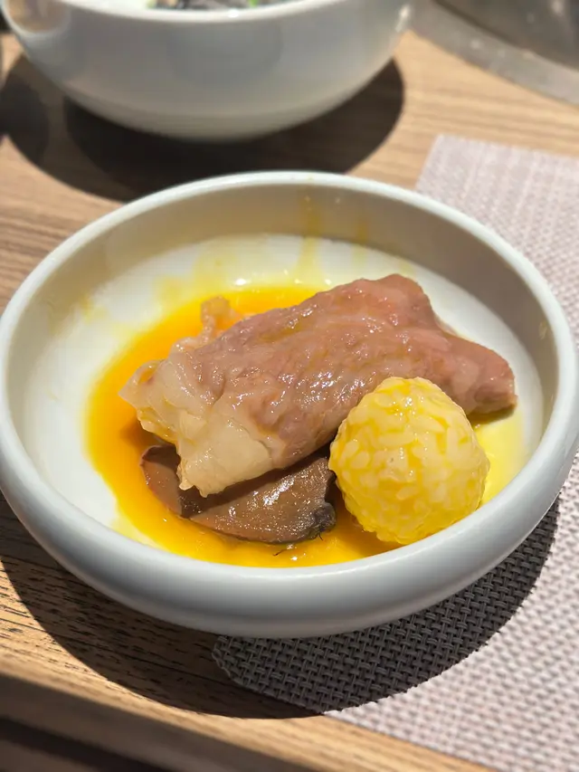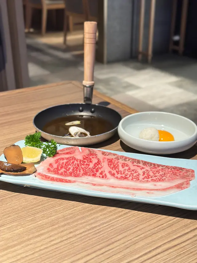 和牛油花均勻,涮煮係甜鹹適中嘅壽喜燒醬汁及牛肝菌中,瞬間吸滿湯汁,點上蛋黃汁配飯食,十分嫩滑滋味