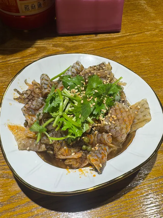 吃川菜怎能少了開胃小食?這裡的涼拌魚皮絕對是首選!魚皮處理得乾淨無腥味,保留恰到好處的厚度,口感爽脆彈牙。搭配特製的麻辣醬汁與香菜、花生,微辣中帶著清香,既開胃又解膩。