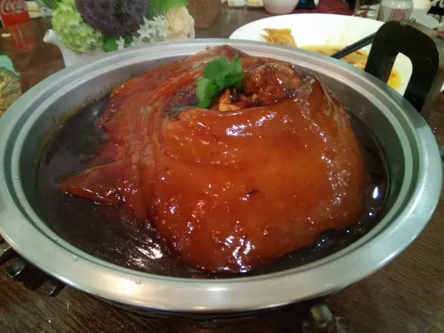 江南百花雞。這個好吃,雞裏面是花膠。手工菜。