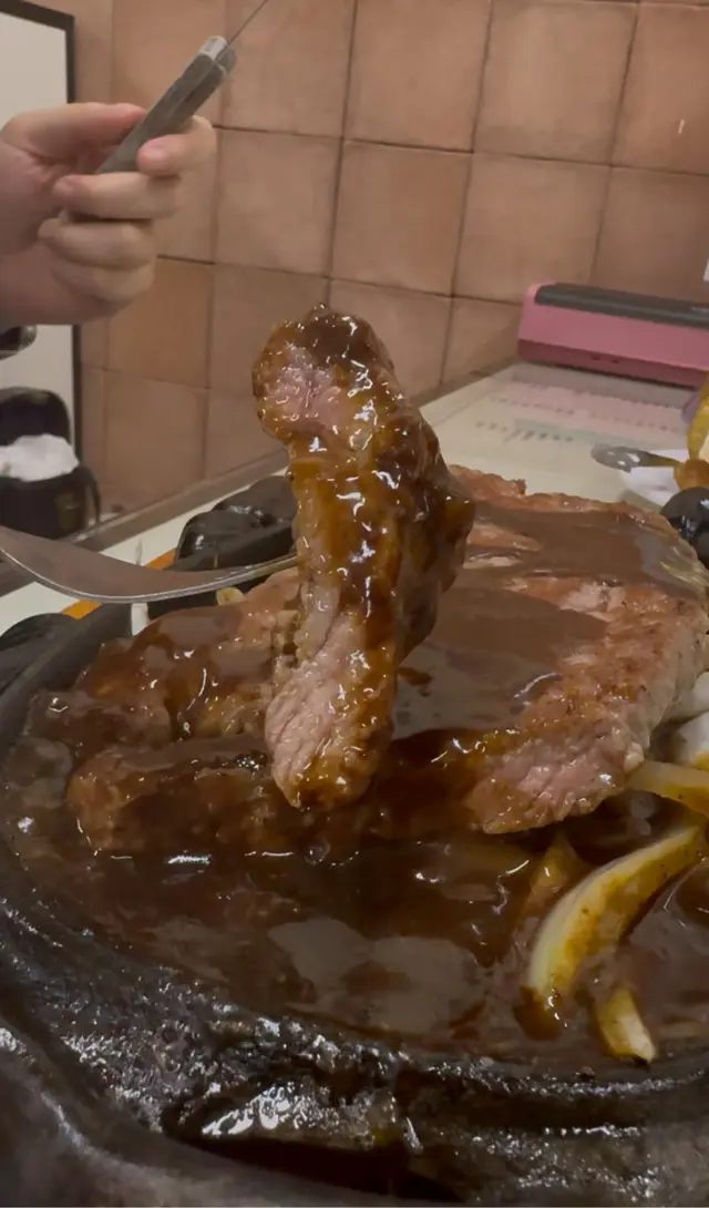 牛扒份量頗大,為經典鐵板牛扒配置。薯菜有別一般鋪底,呢度另上比你,具有脆度。