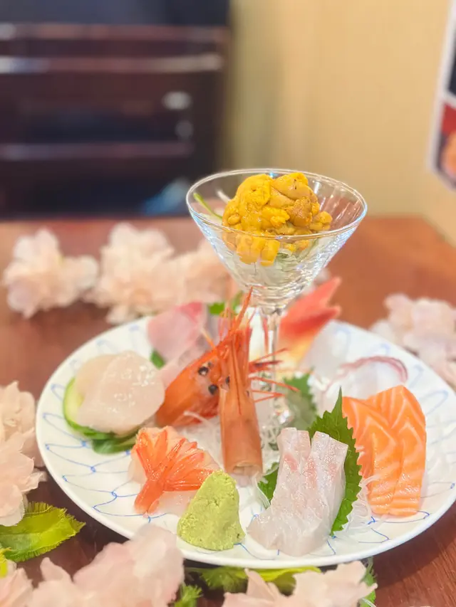 日本海膽杯+錦繡刺身,刺身包括、帶子、牡丹蝦、鯛魚、三文魚、八爪魚、北寄貝和油甘魚。魚生刺身全是厚切,款款肥美新鮮。