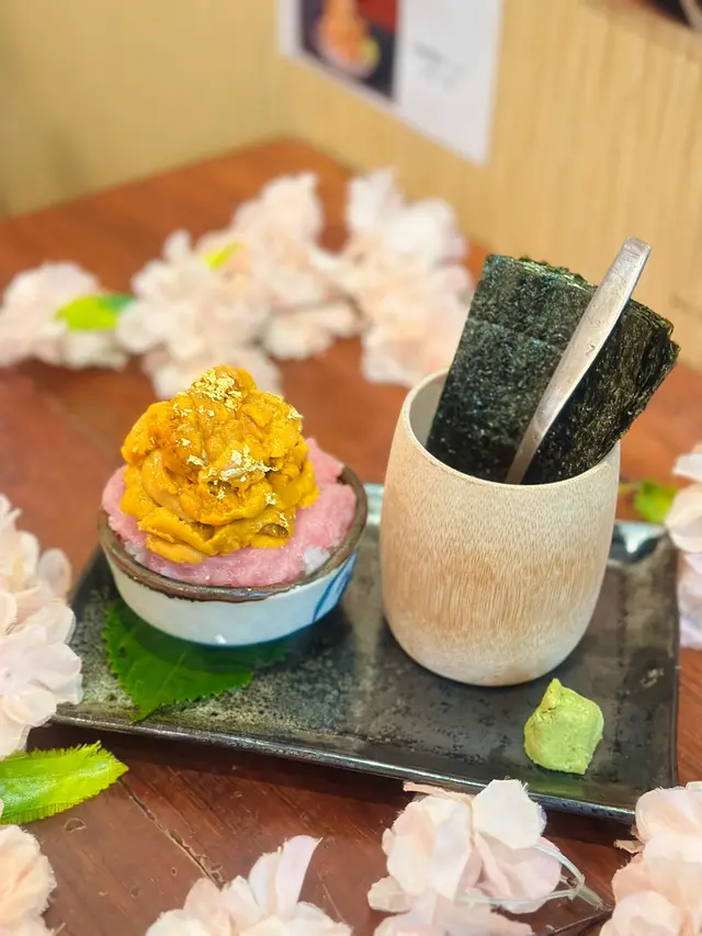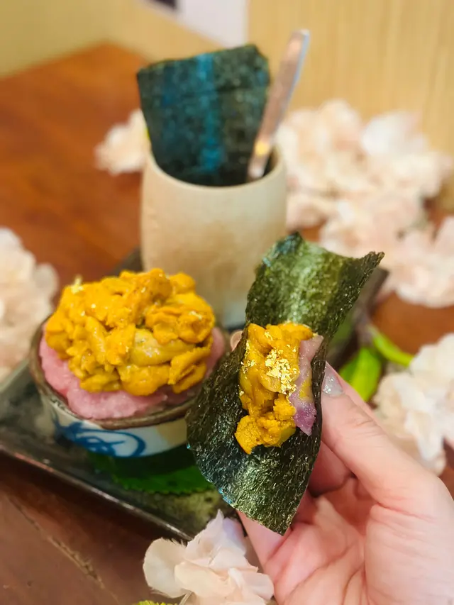 個人最喜歡吃海膽了…「鮨一」人氣大熱的千層海膽飯一定能夠吸引大家眼球。珍珠飯上鋪上吞拿魚蓉,上面叠滿滿一層層的海膽,再加上金箔加持,海膽山造型氣派滿滿,份量十足,吃時以紫菜包起食材,海膽入口軟滑即溶,非常鮮甜,同時滿足大家的視覺與味覺,大推 !