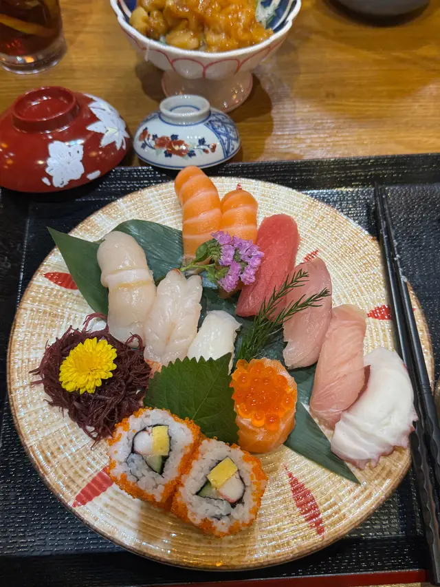 非常豐盛!有三文魚刺身:鮮甜濃郁,脂肪含量較高,甜感更明顯。肉質緊實有彈性,咀嚼時能感受到纖維的細膩。油甘魚:入口柔滑而不膩。吞拿魚:鮮味濃郁,帶有微酸。北海道帶子:入口是海洋的清新,咀嚼是天然的甘甜,口感在嫩滑與彈牙間取得完美平衡,余味是純淨而持久的鮮醇。左口魚裙邊:咬
