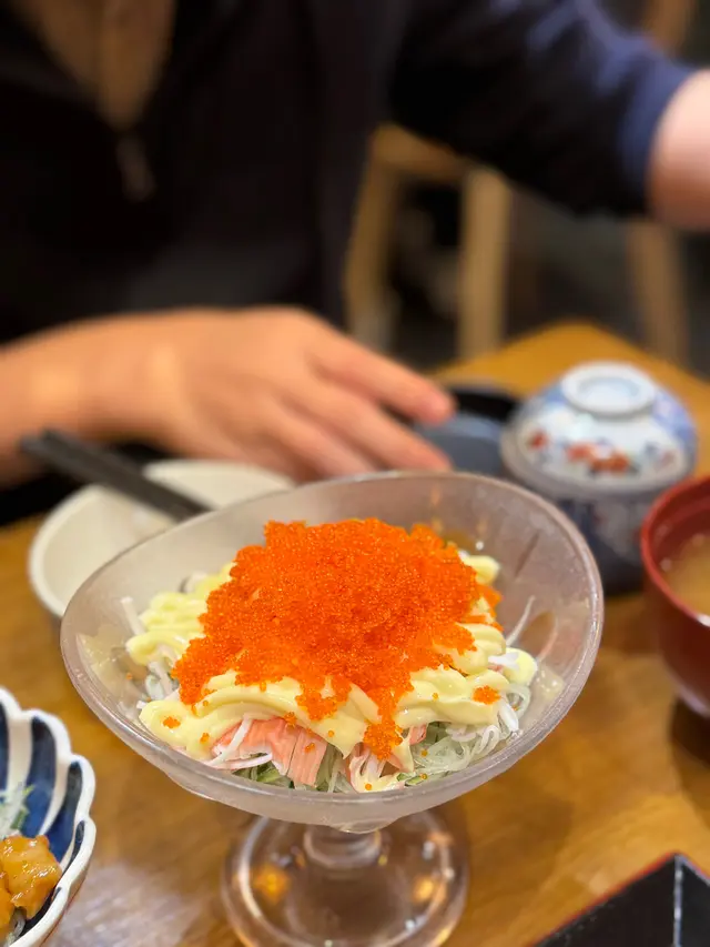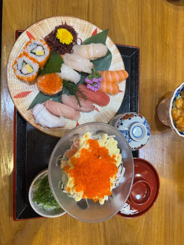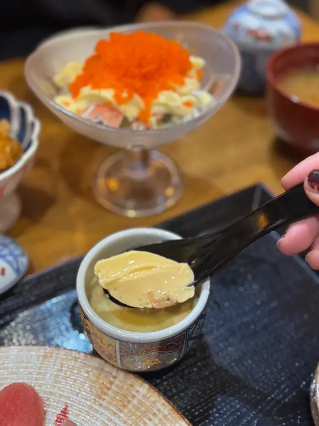 三文魚夠曬肥美。油甘魚油脂豐韻、池魚帶有彈性,八爪魚、真鯛魚、北海道帶子、魚籽花之戀、大赤蝦、吞拿魚、加州卷、味增湯,茶碗蒸:夠曬細滑、口感細膩滑嫩猶如布甸,充滿味噌味,包含竹輪和蟹柳,好味。整個定食好豐盛。