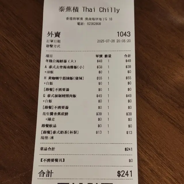 食物推介:冬陰公海鮮湯(大) $48,泰式去骨海南雞飯(小) $38,黄咖喱牛筋腩飯(微辣) $55,泰式秘制豬頸肉飯 $49,花生醬香蕉煎餅 $38,[跟餐]泰式奶茶(杯裝) $13