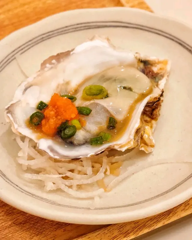 朋友就叫咗呢款什錦海鮮刺身丼,飯底同樣用上日本產米,面頭鋪滿6款刺身咁多,有特大赤海蝦、三文魚腩、吞拿魚、三文魚子、鯛魚同燒鰹魚。刺身質素雖然唔算上頂級,但已經算唔錯,最正係爽彈鮮甜嘅特大赤海蝦同厚切肥美嘅三文魚腩。呢款丼飯更加可以+$40配埋優惠定食,除咗前菜、麵豉湯、甜品同果茶,仲跟1隻兵庫縣產湯霜牡蠣。蠔肉飽滿鮮甜,入口爽滑,配埋蔥同辣蘿蔔蓉就更加帶出蠔嘅鮮味。