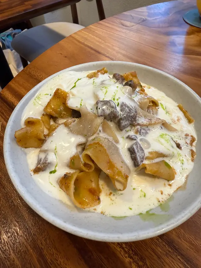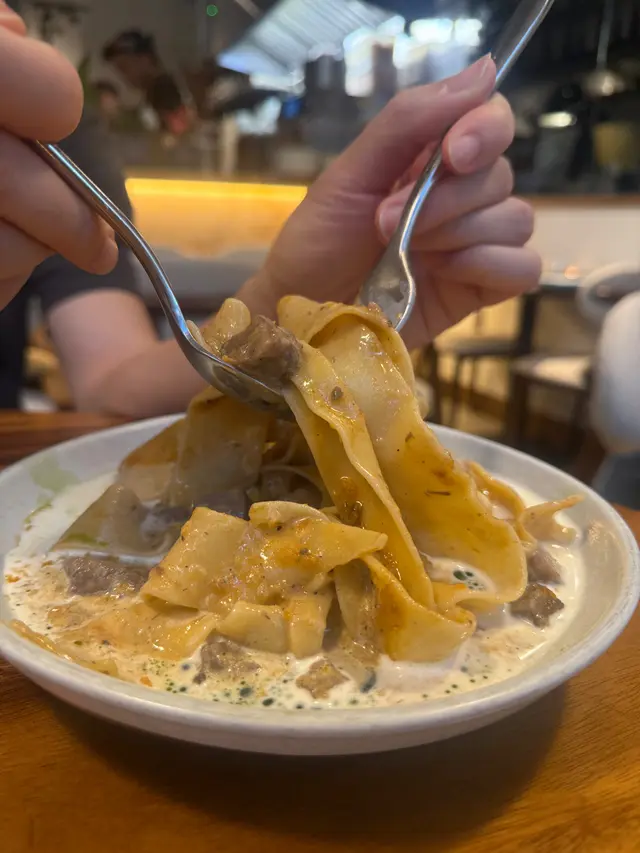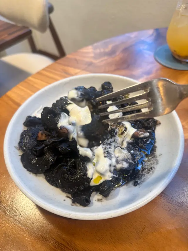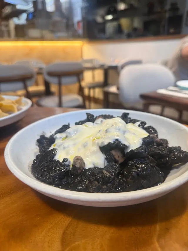 今次試咗一款「我很醜但我很好吃」嘅墨汁八爪魚雞冠粉~雞冠粉係好似通粉再加上花邊嘅意粉,口感會Al dente d~ 加上通心,每粒麵可以染到啲墨汁😋墨汁個味幾好,會食到有少量洋蔥同八爪魚粒。另外一款有d似上次食過嘅一款闊條麵,不過今次upgrade成燉牛小腿肉同重量級芝士泡沫~成個麵再creamy d ,牛小腿肉煮得好軟熟!個人覺得仲好食過牛面頰肉😆