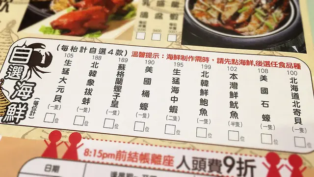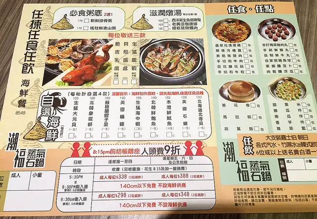 任揀任食任飲海鮮餐,先有滋潤燉湯三選一,必食粥底二選一、每位另外奉送脆皮乳鴿、貝殻盛盆和生猛龍蝦半隻。至於輪到海鮮蒸氣鍋,當中九款海鮮可選四款,包括生猛大元貝、北韓象抜蚌、蘇格蘭蟶子皇、美國桶蠔、生猛海中蝦、北韓鮮鮑魚、本灣鮮魷魚、美國石蠔、北海道北寄貝。
