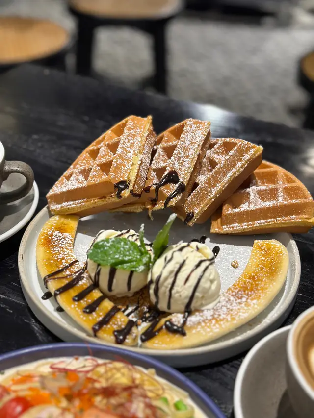 呢個窩夫要推介比甜品控!窩夫大大份有四件 ,配兩球雲呢拿雪糕。窩夫厚身外脆內軟 ,有陣陣蛋香,上枱要盡快食!配搭焦糖香蕉同朱古力醬,每啖食落都好滿足好清甜,必食!