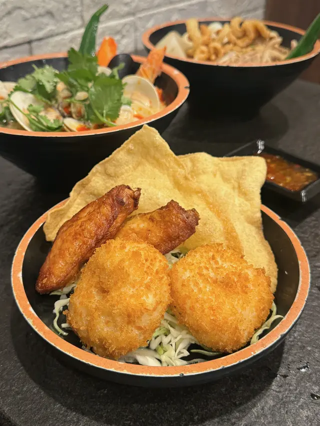 小食包括蝦餅,雞翼同炸芝士雲吞