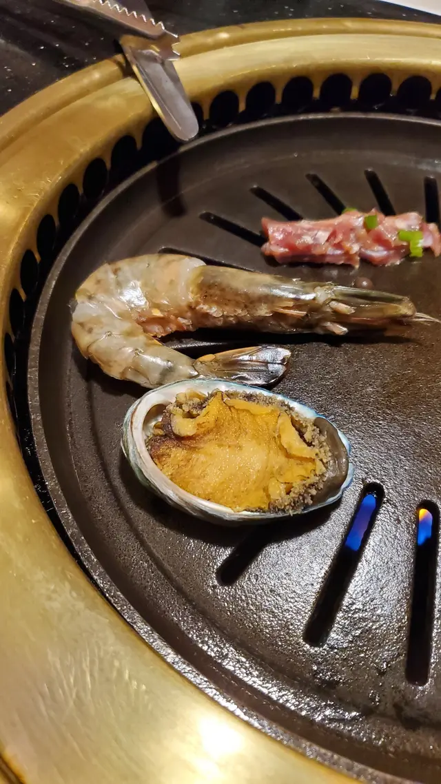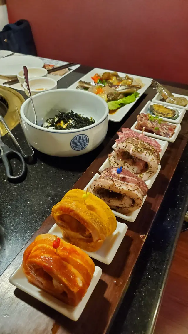 肉類都是由韓國進口的牛/豬肉,包含四色調味五花肉(蒜蓉、香草、咖哩、辣椒醬)、牛肉(雪花牛肉、調味烤裏脊)和海鮮(鮑魚、大蝦)。五花肉肥瘦適中,醃得相當入味;牛肉油花均勻,軟嫩帶有咬勁;海鮮新鮮,鮑魚彈牙,蝦肉紮實。一個拼盤份量已足夠情侶或2-3人食用。