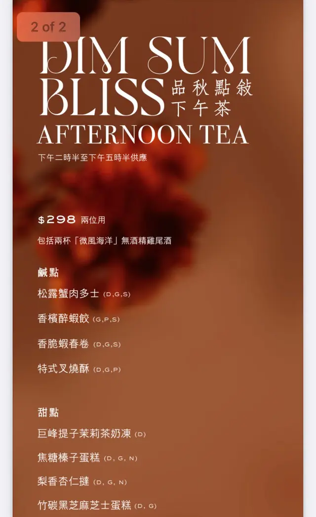 最喜歡是松露蟹肉多士,難得多士仍是脆的!其次是香檳醉蝦餃,不過個皮一夾就穿咗,而兩款炸同焗的點心比較油膩,要有心理準備唔算係好高質素的中式酒樓點心~
