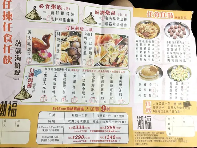這個放題主要分為5個部分,首先是燉湯(二選一)和揀選粥底(二 選一),之後每位會送三款指定食品(四選三);跟著便是主角海鮮 登場,可在九款海鮮內自選四款。最後就是任點部分,有大概二十款 菜蔬和肉類供客人選擇。